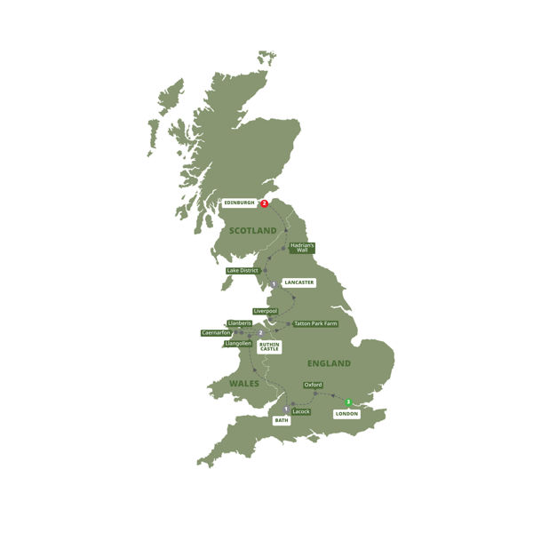 Journey into the Lake District, whose landscapes have inspired writers and poets for generations. You can explore further with an Optional Experience steam train ride followed by a tranquil cruise across Lake Windermere. Then, dive into Roman history as you explore Hadrian's Wall and the Roman Army Museum, getting a glimpse of life as a soldier defending Emperor Hadrian’s northern frontier. Continuing north, cross the border into 'Bonnie Scotland' and arrive in Edinburgh, Scotland’s capital. The evening is yours to discover the city’s charm and character at your own pace.